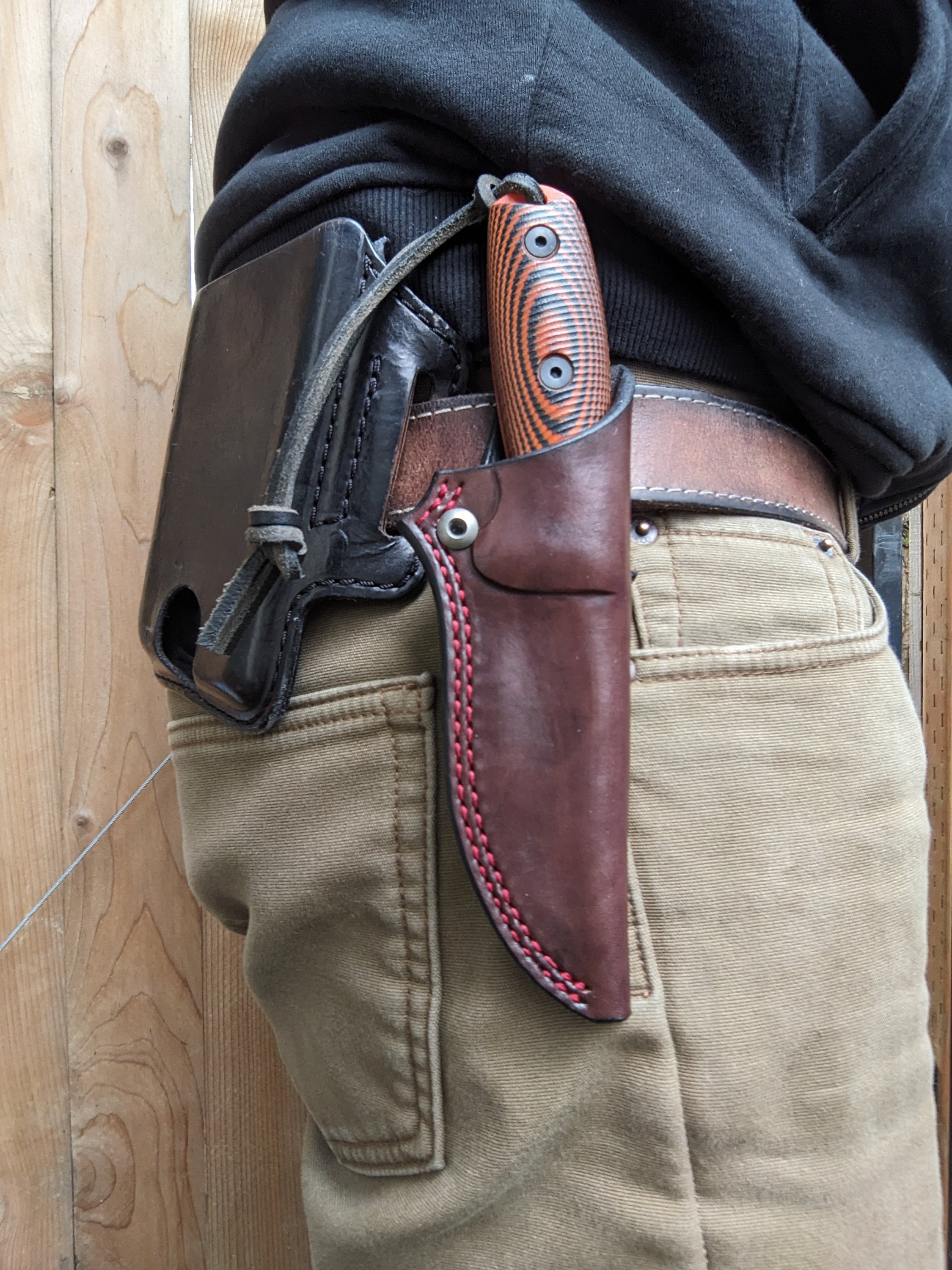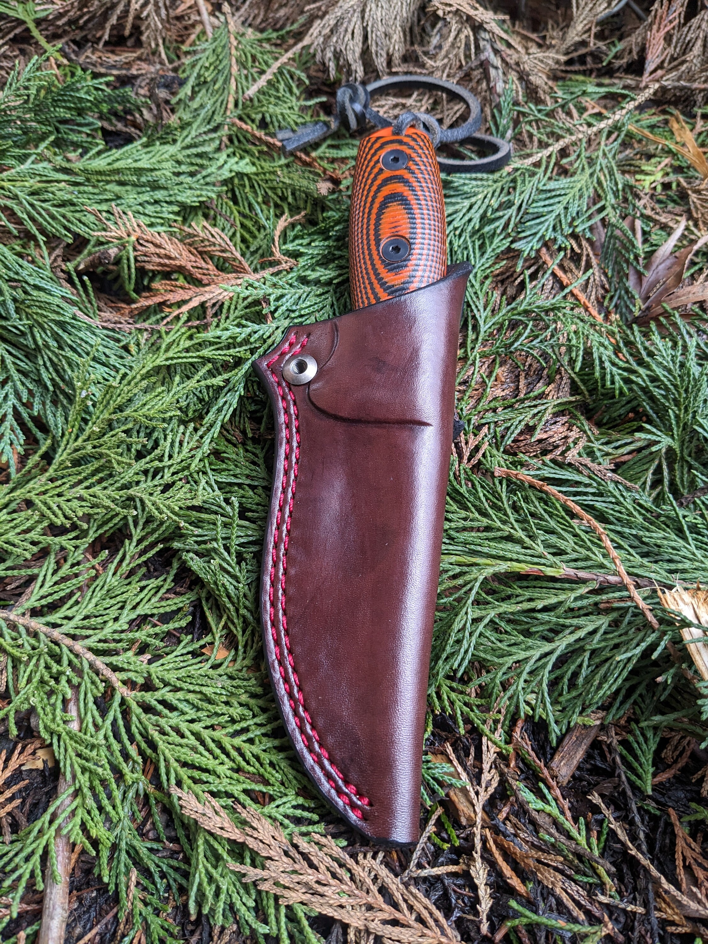 Handmade Leather Sheath for an Esee 3. Dark Brown with crimson thread. Wetformed for snug retention which does require some break-in time.