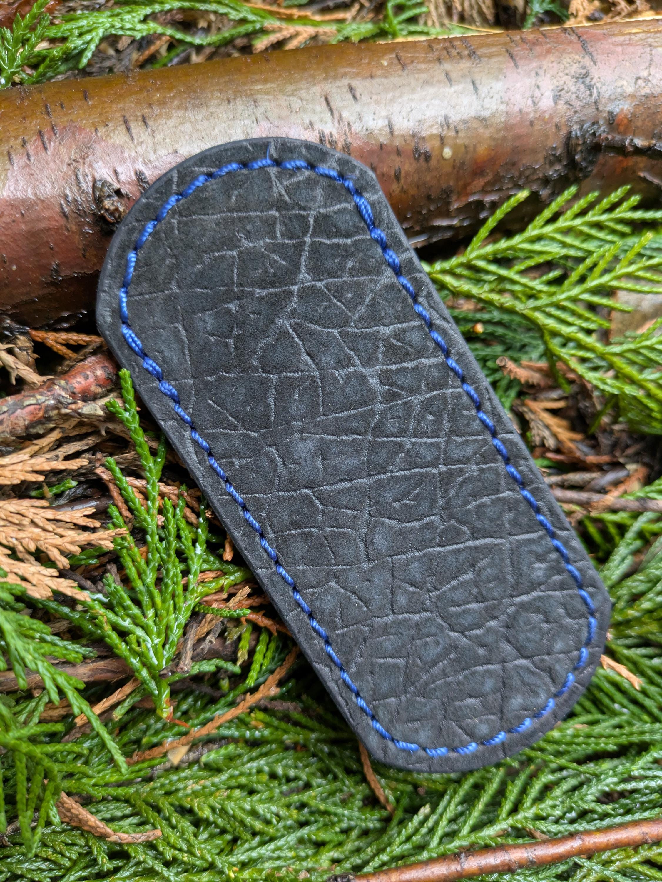 Leather knife slip for smaller folding knives and pocket tools such as prybars and bottle openers. Made with Zimbabwe Safari Hippo and interior lining of Mission Grain pigskin and Royal Blue accent thread.